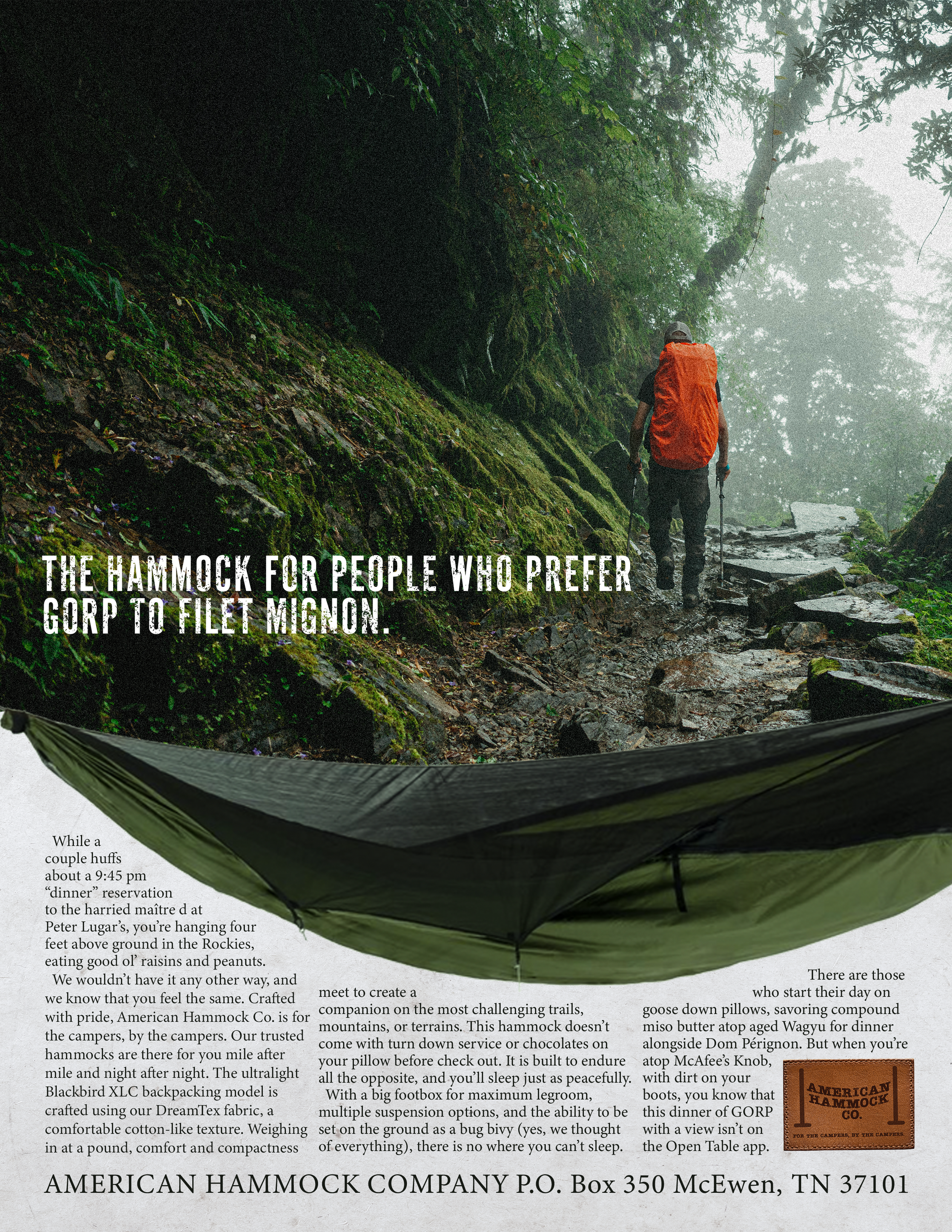 In order to authentically target consumers, we had to learn where they go, where they don’t go, and what they eat. By strongly positioning American Hammock Co.’s Blackbird XLC hammock as the campers’ hammock, while our target is flipping through outdoors catalogs, they’ll find a useful and relatable product in-between planning their next trip or splurge on gear.