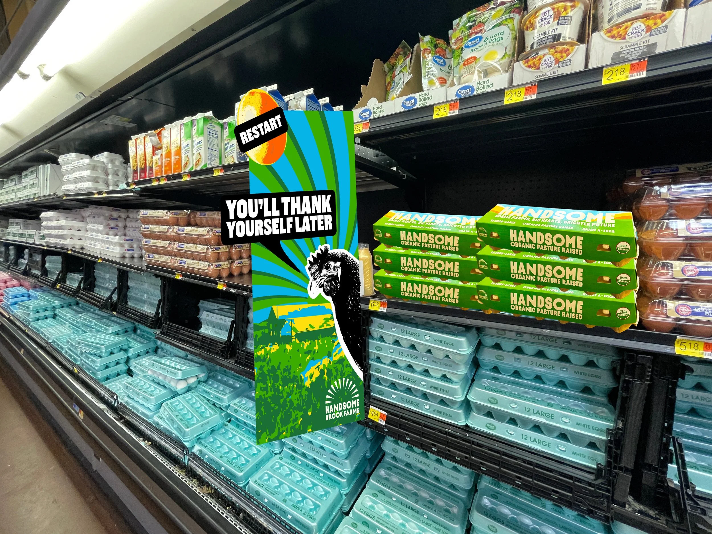 While our target is grocery shopping and surrounded by choices, we want to give a helpful peck - and remind them the best eggs are handsome eggs.